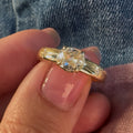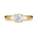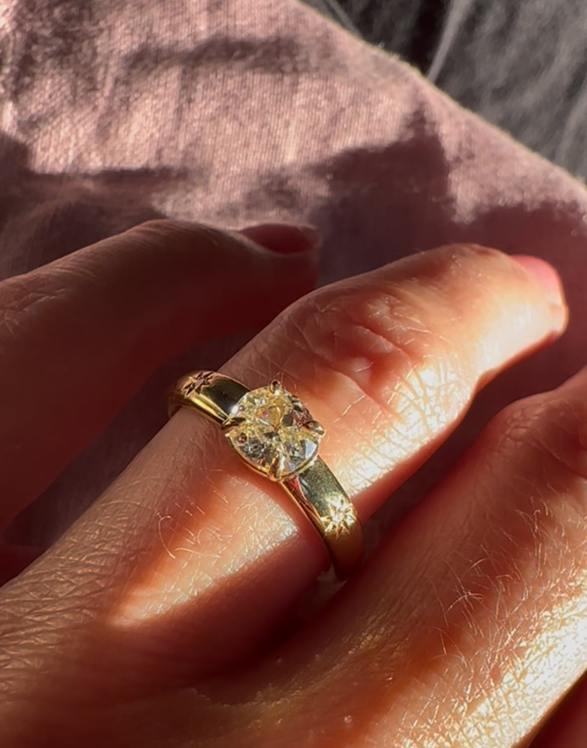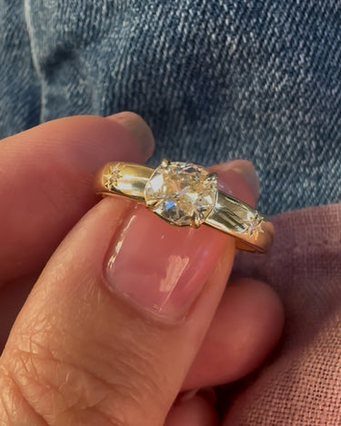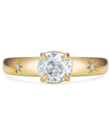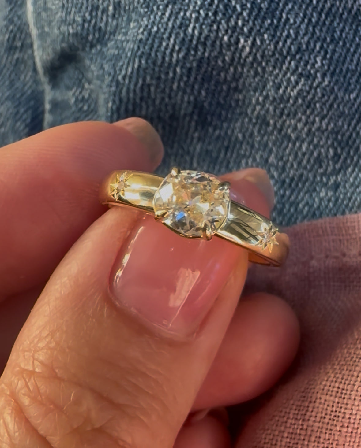 Set in solid 18 carat gold, this ring features an old cut diamond set in a four claw setting with two star set diamonds. Each piece is handmade to order, making every ring entirely unique.