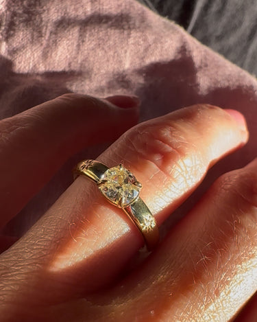 As part of our bespoke process, you will be closely involved in selecting your diamond and invited to choose the stone that feels right for you. The diamond shown here is an antique old mine cut.